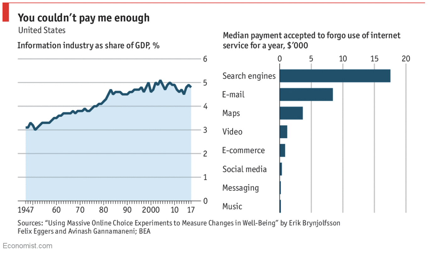 Internet giants like Google and Facebook do not charge for access. Zux’s value generation is therefore not included in national-income statistics. Another reason why GDP is flawed - it only accounts for stuff we part with our cash for. A study by three economists aimed to quantify this missed value - estimating up to $17,500 is the minimum median amount needed for us to stop using search engines for a year. So basically pay me 20 bags a year to live without Google (how would we live without immediately fact-checking our mates?! Also Consulting as an industry would likely die). Below are some more of these staggering numbers: